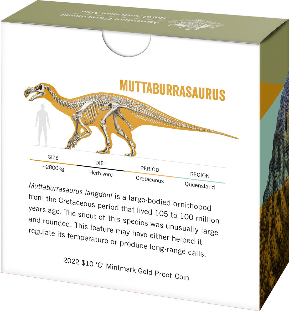 This exciting coin design features Australia’s unique and veracious Dinosaur predator - the Australovenator, with the packaging features another iconic Australian Dinosaur – the Muttaburrasaurus.