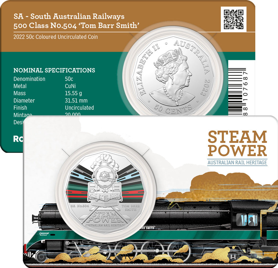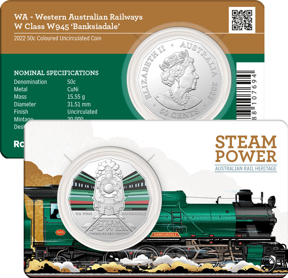 Discover the romance and thrills of Australia’s steam history with this exciting 2022 50c Coloured Uncirculated Seven-coin Set by the Royal Australian Mint, which brings together seven iconic locomotives celebrating the golden age of Australian steam. With three release over five months the collection can be kept in a beautiful and informative folder as a treasured keepsake to Australia’s rail history.