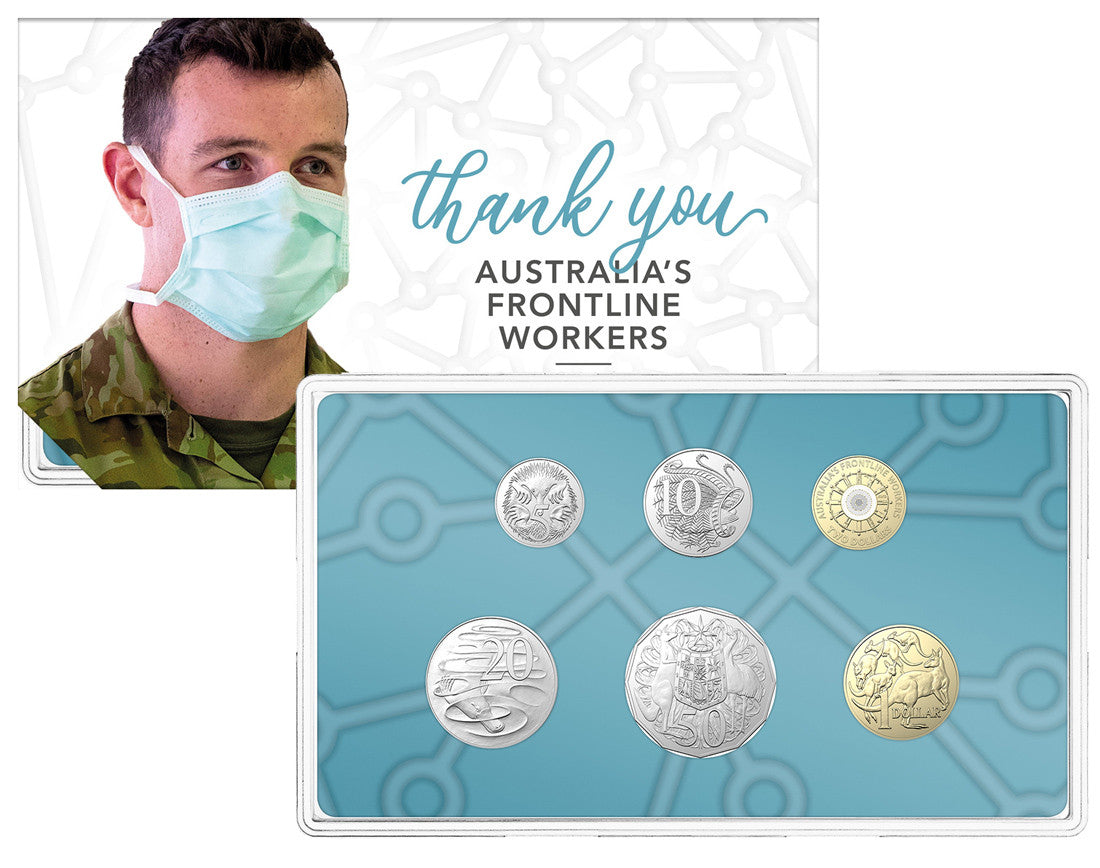 The set features a specially designed coloured two dollar coin showing twelve frontline worker pictograms encircling a connected pattern representing all Australians.