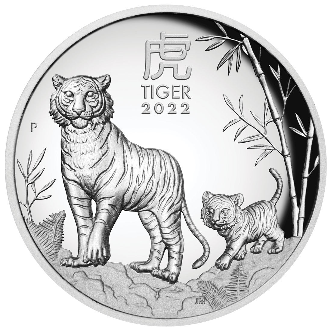The coin’s reverse portrays a representation of a tiger cub following its proud and protective parent across a rocky terrain featuring ferns and bamboo. Included in the design is the Chinese character for ‘tiger’, the inscription ‘TIGER 2022’ and The Perth Mint’s ‘P’ mintmark.