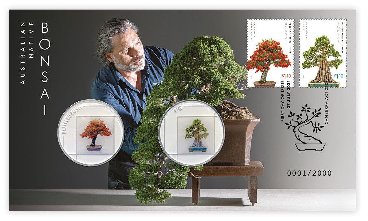 This stamp and medallion cover is a very limited collectable, featuring a pictorial envelope with the two $1.10 stamps from the Australian Native Bonsai stamp issue and related medallions. The stamps are postmarked - First day of issue | 27 July 2021 | Canberra ACT 2601