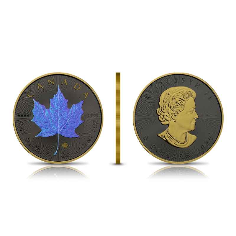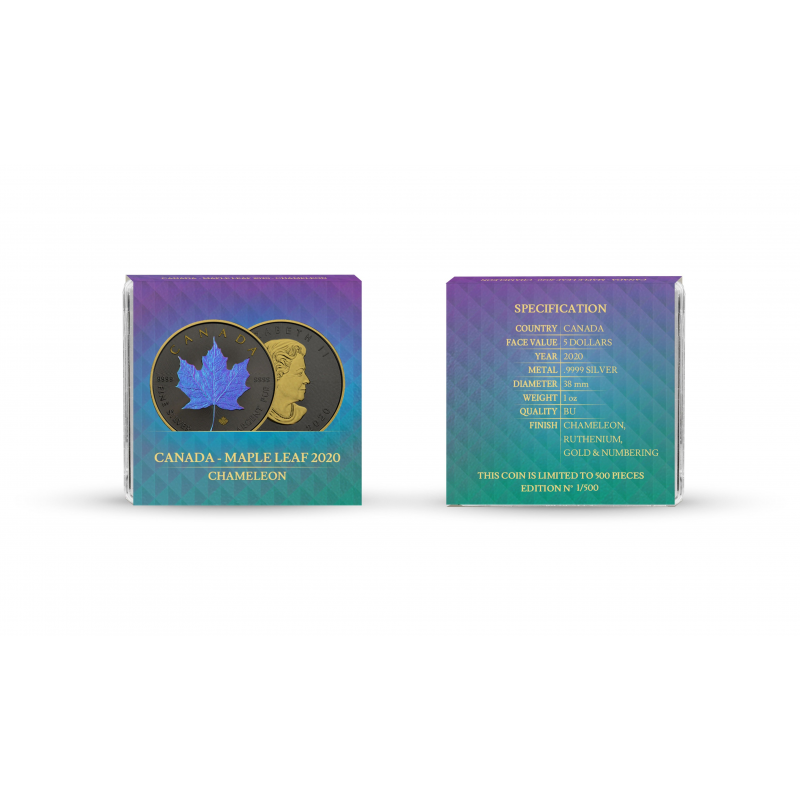 Chameleon is a special edition of coins refined with Ruthenium, Gold and a new special coating – Chameleon. The maple leaf covered with Chameleon, shimmer in different colors depending on the incident light. The effect, together with Gold and Ruthenium, is unprecedented and it is hard to look away from it.
