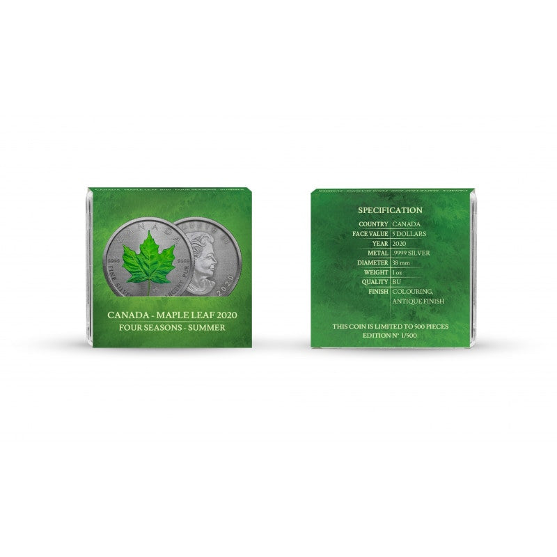 The "Canadian Maple Leaf Four Seasons" series is an ennobled adaptation of bullion coins. To emphasize the uniqueness of each season, coins were oxidized and covered with carefully selected colors.