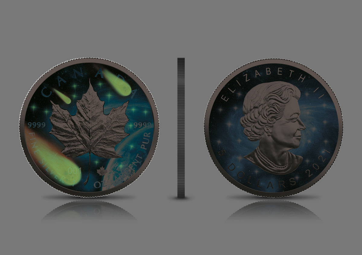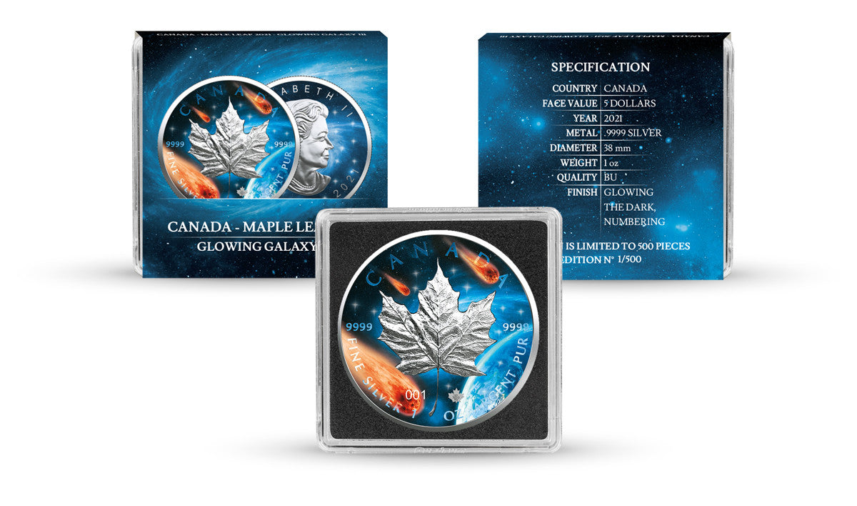 The Canadian Maple Leaf is a silver bullion coin issued annually by the Royal Canadian Mint. The "Glowing Galaxy III" edition is in turn the continuation of a series of galactic ennobling, already well known to Collectors, with new designs and colors for 2021. The amazing "Glow in the dark" effect of the lacquer, enhances the coin's unique stellar detail motif, making it an ideal Collector's item.
