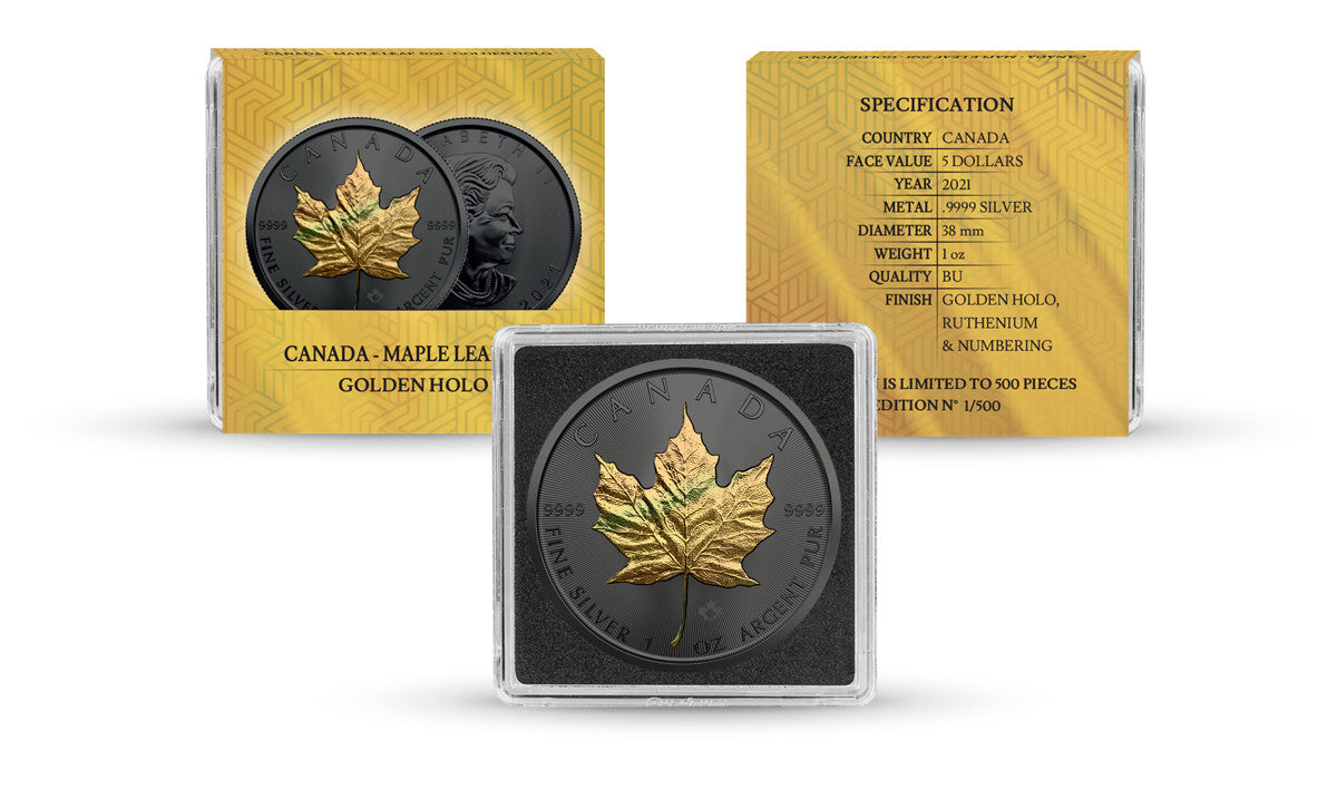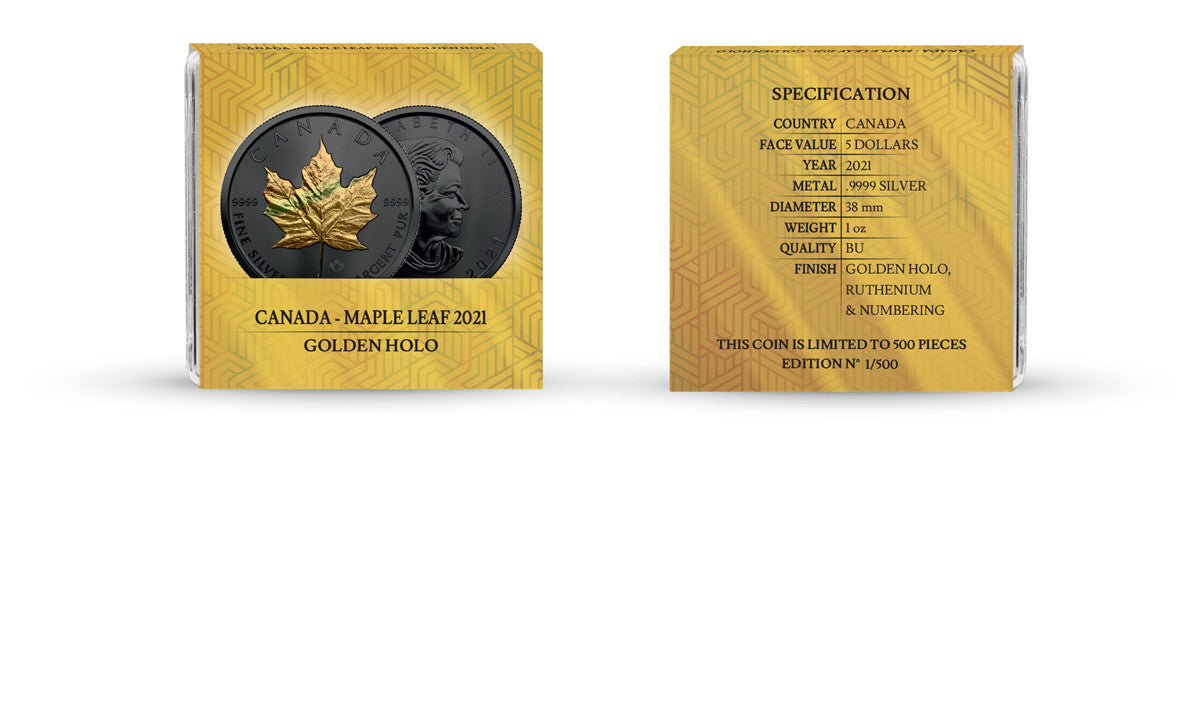 The Canadian Maple Leaf is a bullion coin, released annually by the Royal Canadian Mint. Adaptation of this coin - the Golden Holo - is a version in which the gold-colored hologram effect and ruthenium is used to highlight coin’s details. The Maple Leaf ennobled with golden hologram shimmers with different colors, depending on the incident light. The effect is further emphasized by the use of ruthenium in the background.