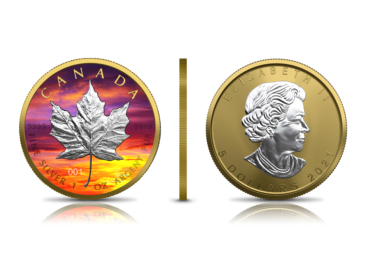 The Canadian Maple Leaf is a bullion coin released annually by Royal Canadian Mint. Sunset is an adaptation of this coin, in which Yellow Gold and Metallic Colors are used to highlight coin’s background. The metallic colors used on the obverse are giving the effect of a setting sun. This effect and the gold background on the reverse emphasize the image of the Maple leaf and the Queen, and the coin gains a new, expressive appearance.