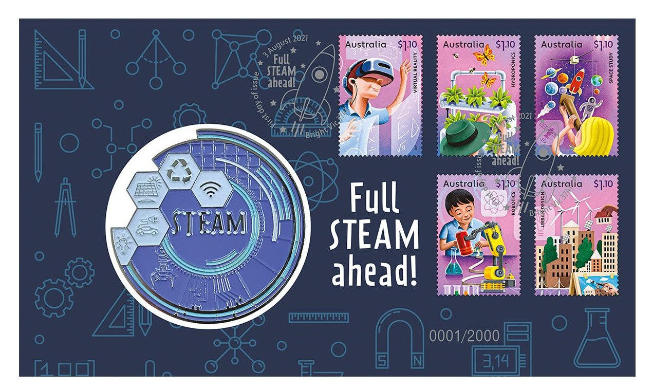 This stamp and medallion cover is a very limited collectable, featuring a pictorial envelope with the five stamps from the Full STEAM Ahead stamp issue and related medallion. The stamps are postmarked - First day of issue | 3 August 2021 | Bright Vic 3741