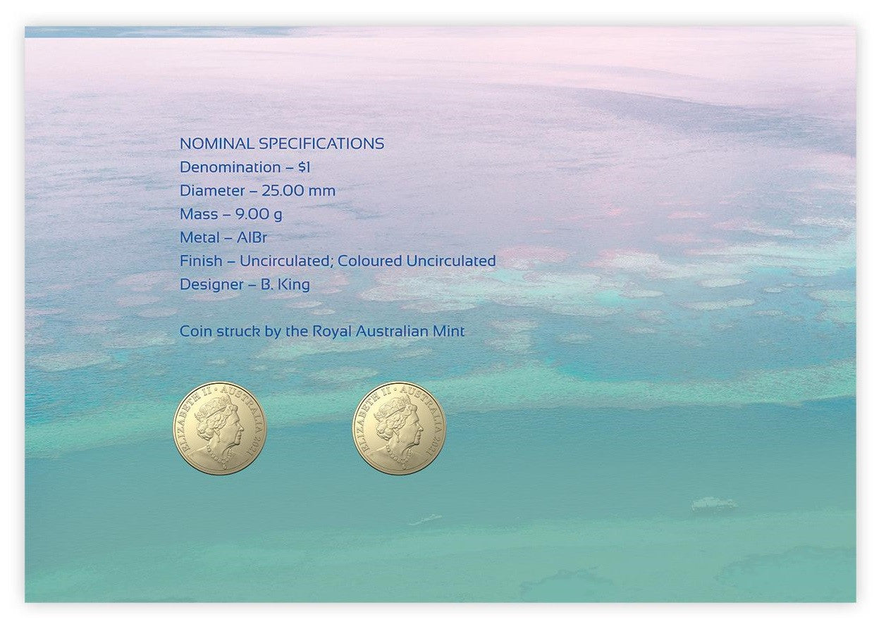 This postal and numismatic cover houses a pair of uncirculated coins in an embellished, limited-edition postage-paid cover numbered to 500. Both coins feature a detail of reef life, with the pictorial element coloured in one of the two coin designs. Produced by the Royal Australian Mint, the coins have been struck in aluminium-bronze.