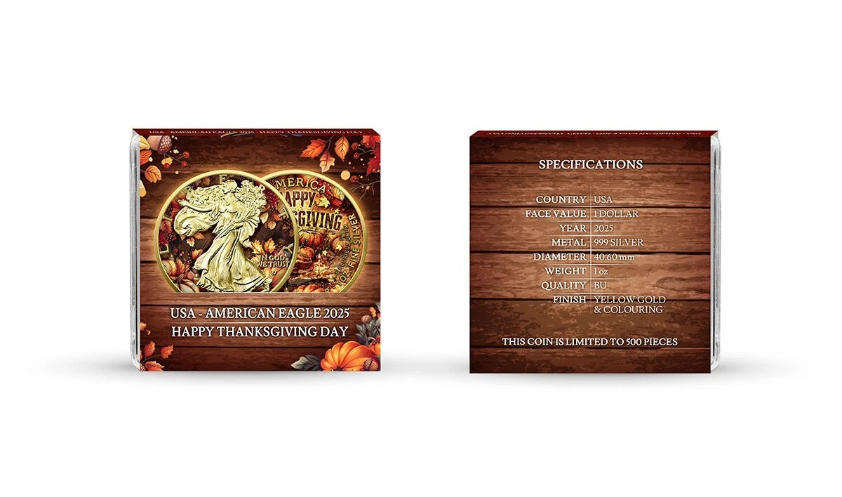 The US Eagle silver coin is one of the most popular and internationally recognised silver bullion coins in the world today. Happy Thanksgiving 1 oz .999 Silver $1 American Eagle 2024 is a stunning reimagining of this iconic coin.