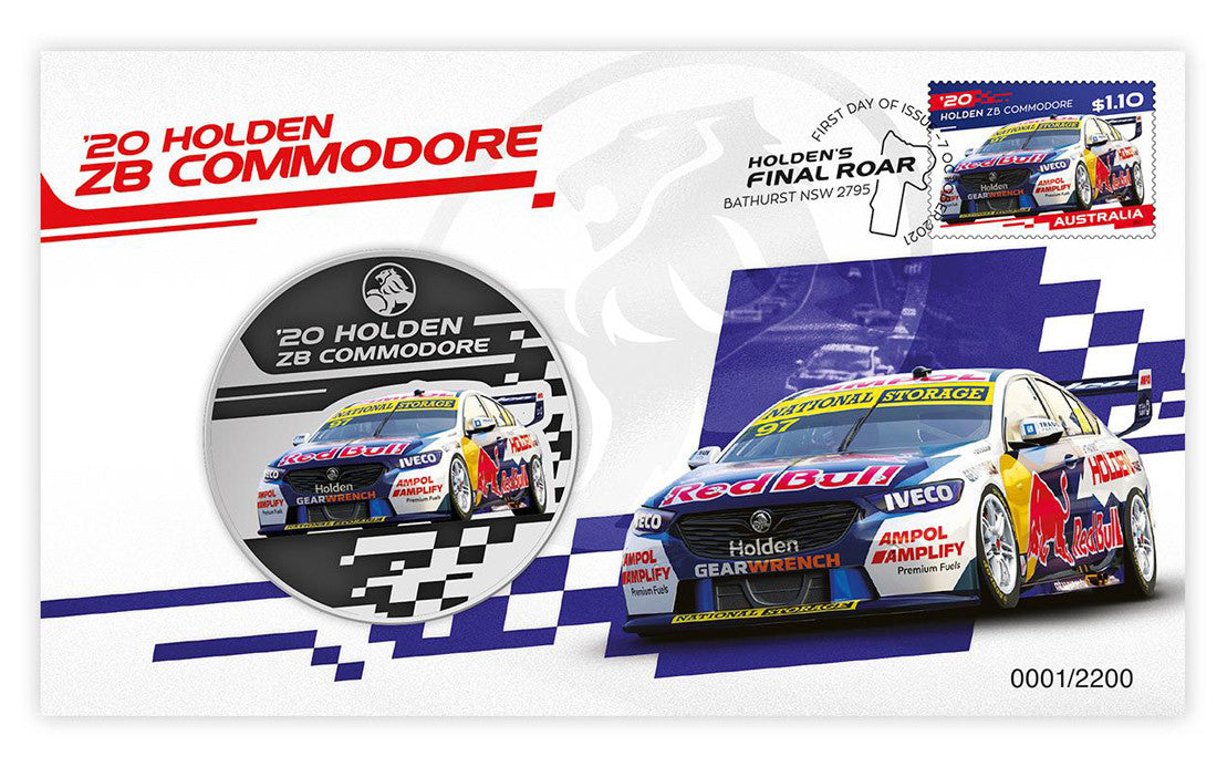 This limited stamp and medallion cover features a pictorial envelope with the $1.10 2020 ZB Commodore stamp from the Holden's Final Roar stamp issue and related medallion. The stamp is postmarked - First day of issue | 7 October 2021 | Bathurst NSW 2795