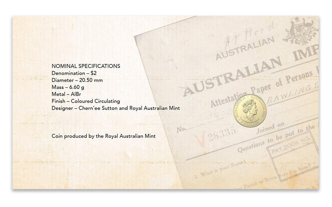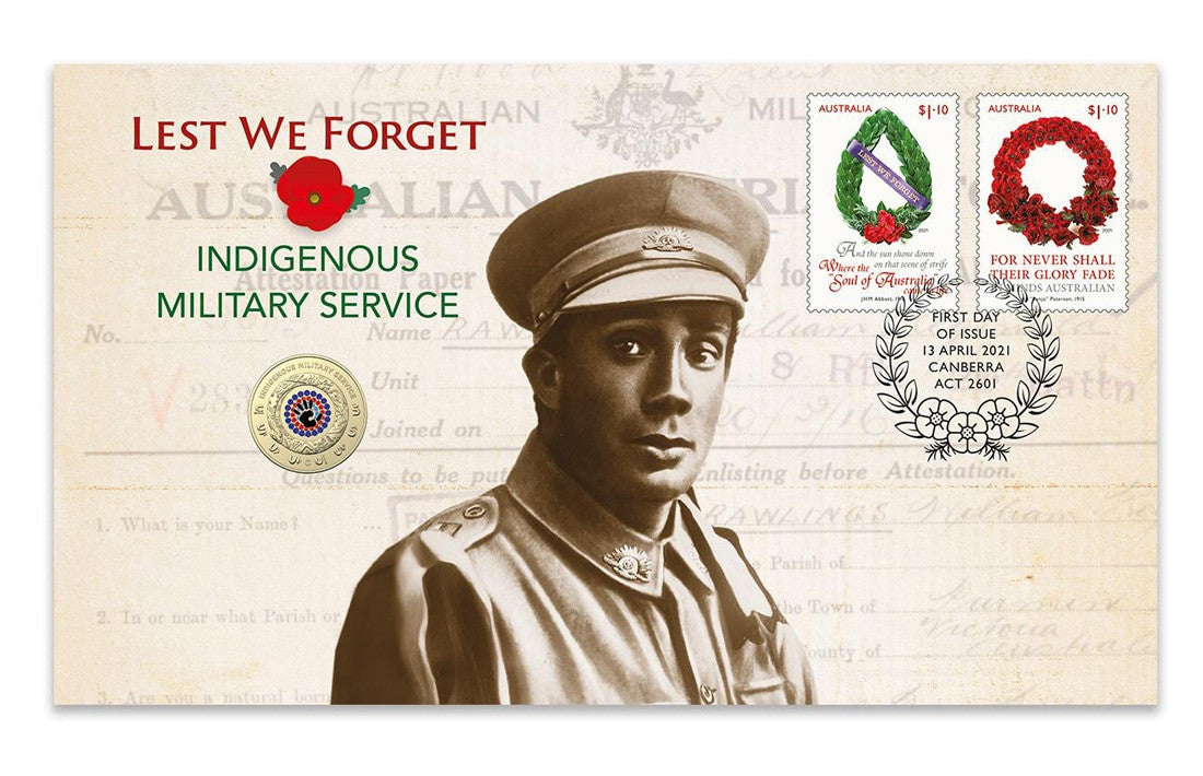 The Lest We Forget Indigenous Services postal numismatic cover is highly collectable, featuring a pictorial envelope with the two stamps from the Lest We Forget stamp issue and a coin from the Royal Australian Mint.