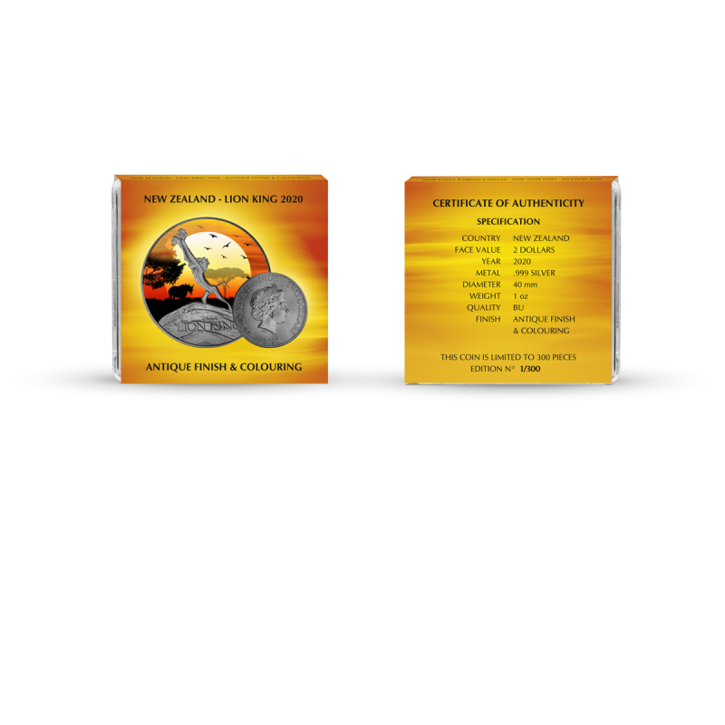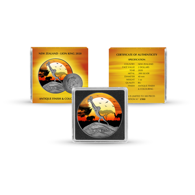 Lion King 2020 is a bullion coin issued by the New Zealand Mint. Lion King Antique Finish & Colouring is an ennobled adaptation of these coins, covered with patina and precise print emphasizes the interesting theme of the coins.