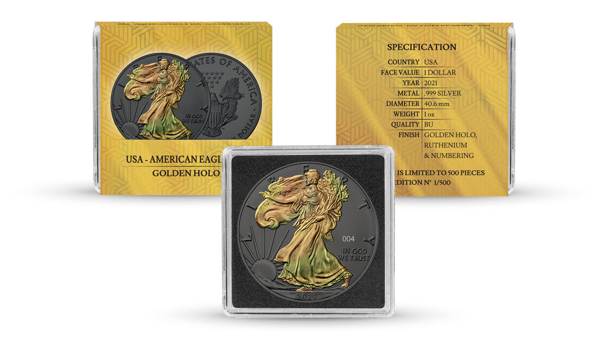 The American Eagle is a bullion coin, released annually by the US Mint. Adaptation of this coin - the Golden Holo - is a version in which gold-colored hologram effect and ruthenium is used to highlight coin’s details. The Lady Liberty refined with golden holo shimmers with different colors, depending on the incident light. This effect is further emphasized by the use of ruthenium in the background.