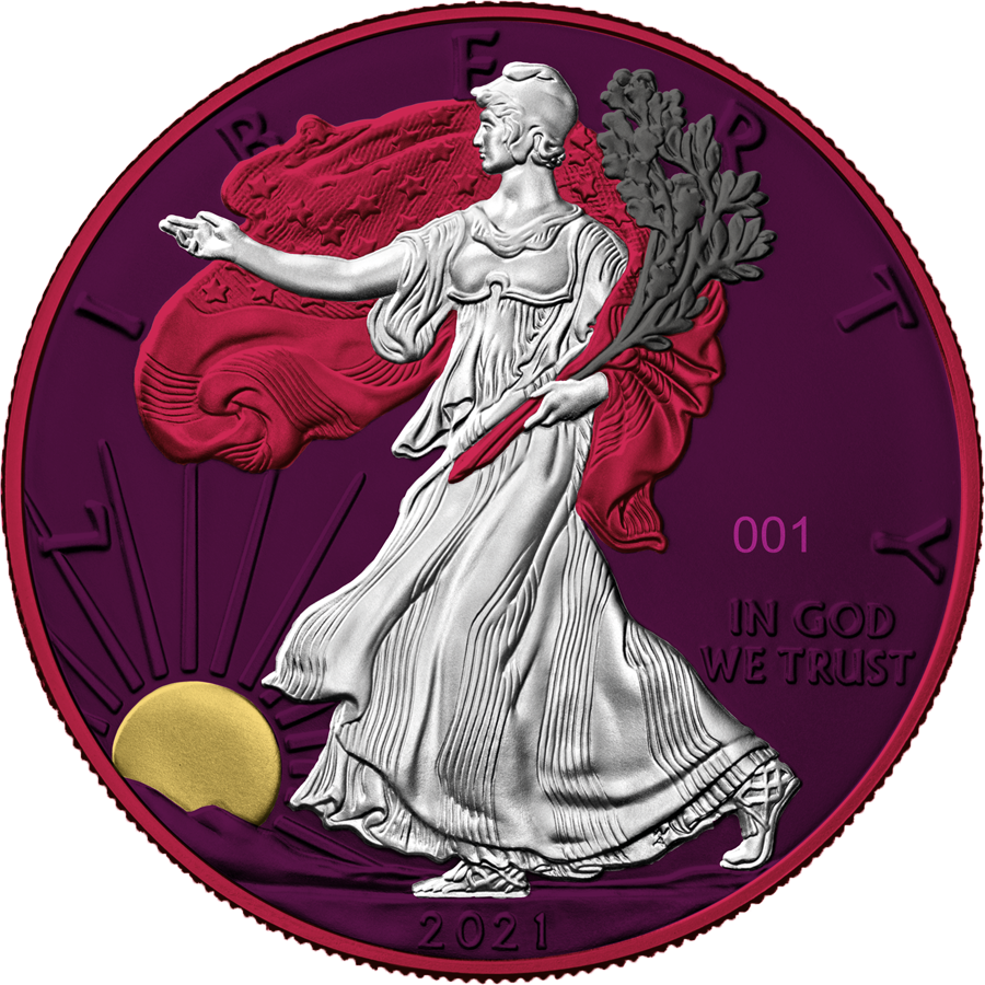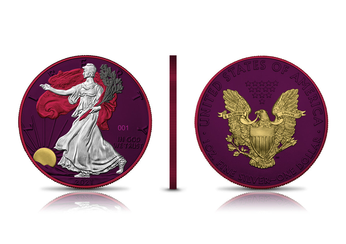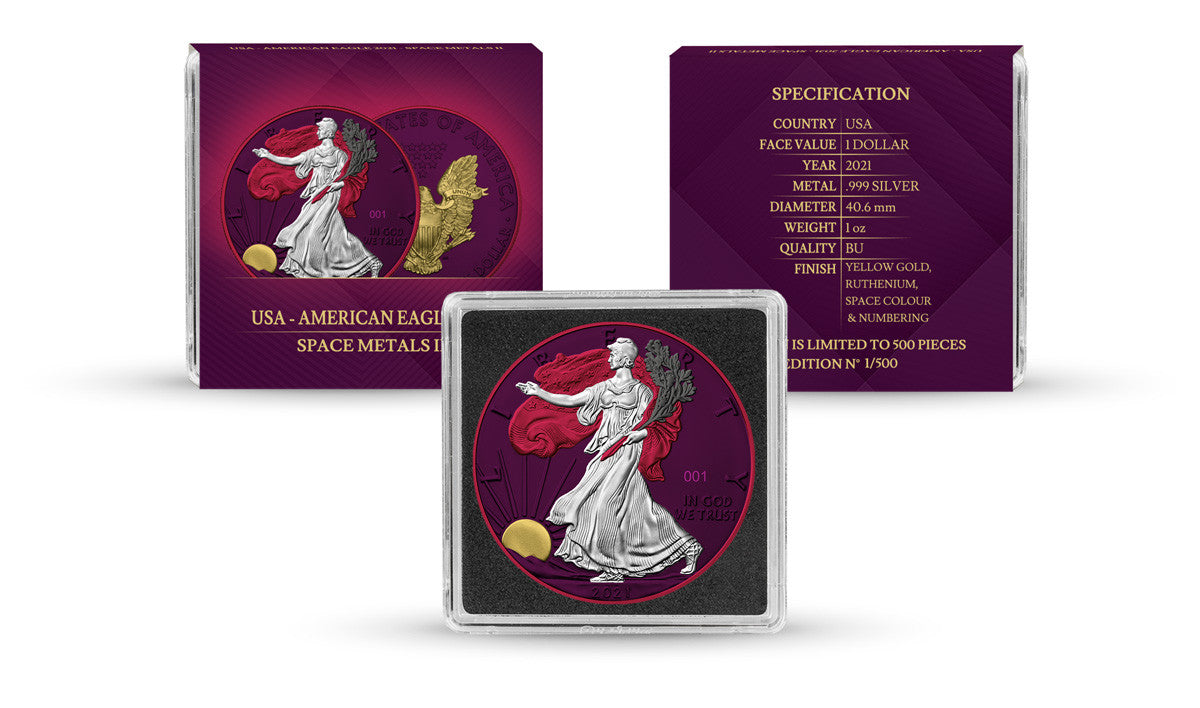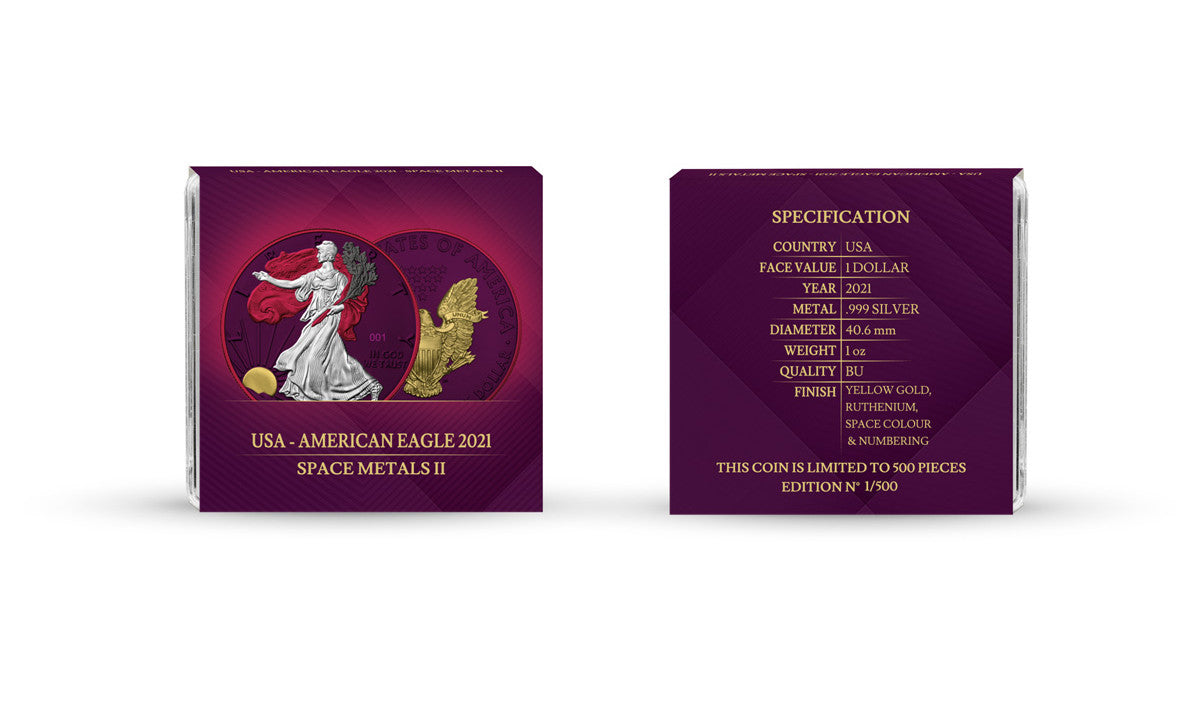 The American Eagle is a bullion coin that is released annually by the US Mint. The Space Metals II is a version in which the Space Pink effect, gold and ruthenium are used to highlight the coin’s beauty. The use of various finishing techniques creates an amazing effect, giving the coin a gorgeous new look.