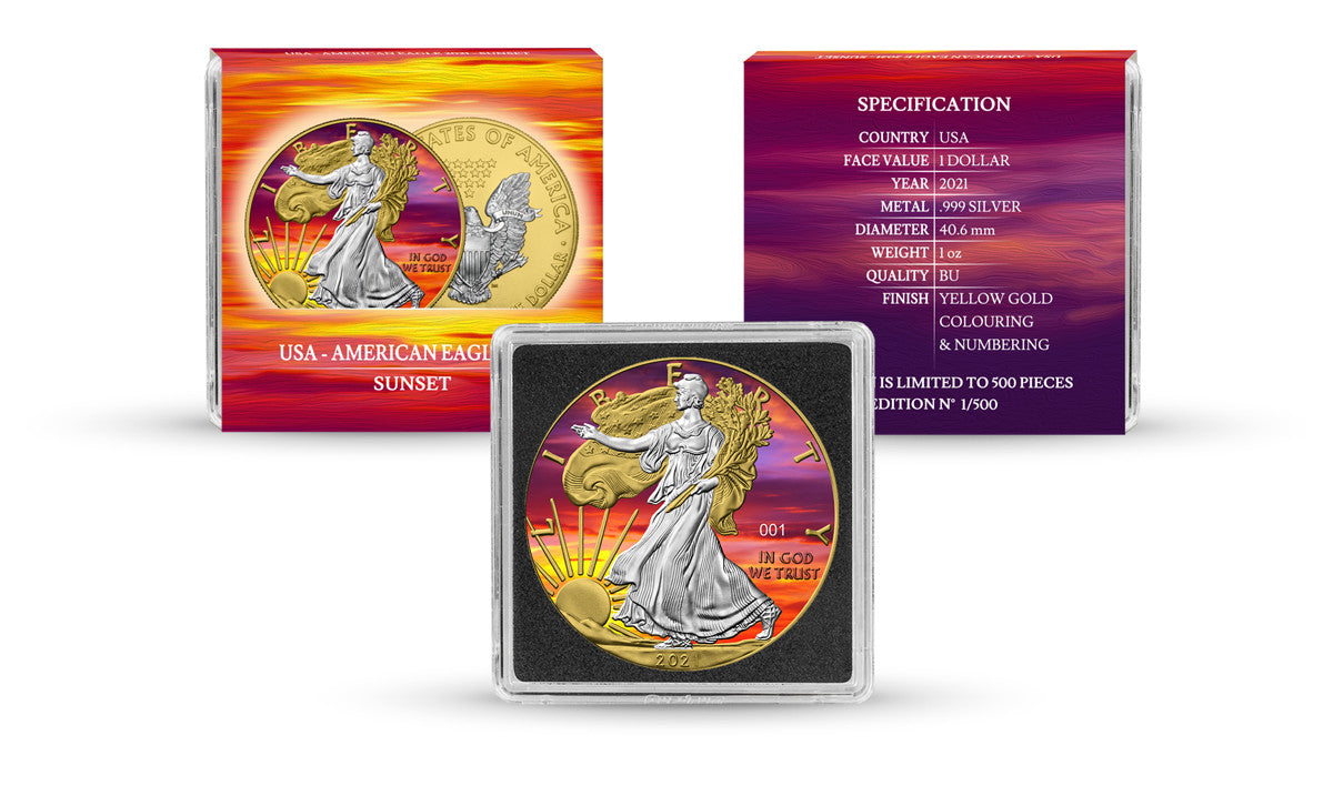 The American Eagle is a bullion coin that is released annually by the US Mint. Sunset is an adaptation of this coin, in which Yellow Gold and Metallic Colors are used to highlight coin’s background. The metallic colors used on the obverse are giving the effect of the setting sun. This effect and the gold background on the reverse emphasize the image of the Lady Liberty and the Eagle, and the coin gains a new, expressive appearance.
